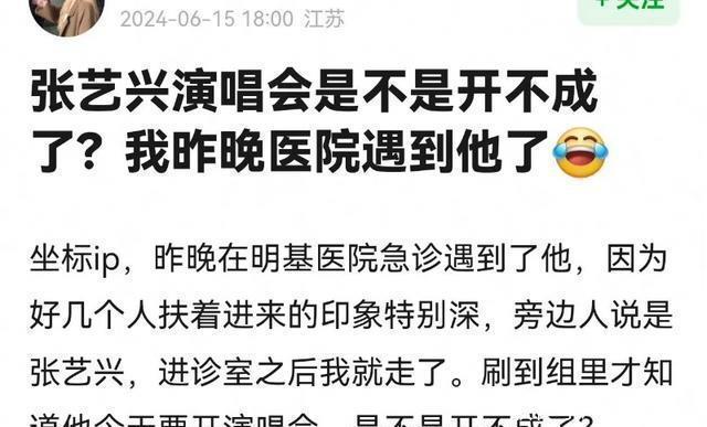 虽然但是,在演唱会当天早上,传出了有网友在前一天,在医院看见张艺兴挂急诊,质疑演唱会是否会顺利举办。 随后就有网友在评论区附和,表示拍到了他在演唱会场馆晕倒的照片。 来看看,网友曝光的照片中,只见张艺兴蹲坐在舞台中央。