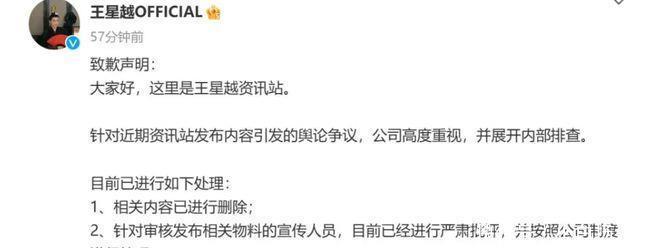 而且还附上了和工作人员的聊天记录,称这个工作人员亵渎了他的艺术 最后他在评论区回复粉丝,会把相关的人都开掉 王星越工作室很快发布了道歉声明